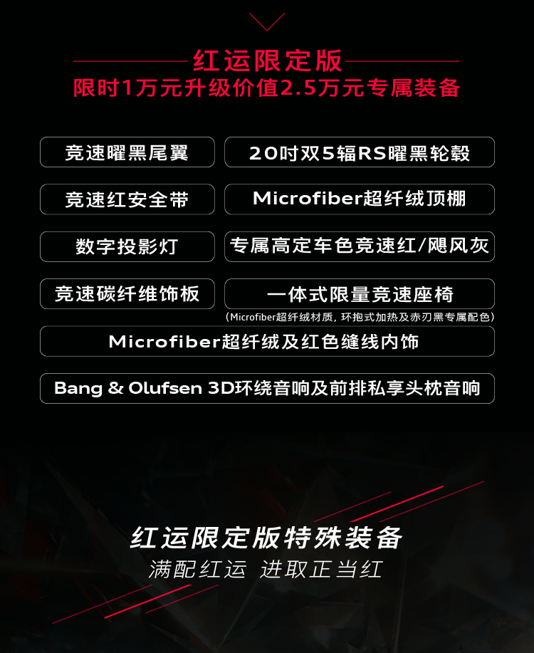 这款新车配有限定专属的“竞速红”配色,限时 1 万元升级包括曜黑尾翼、竞速红安全带、数字投影灯、红色缝线内饰、B&O 3D 环绕音响等在内的专属配置。